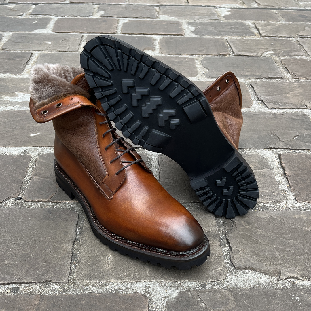 Fabrication artisanale, automne-hiver, style casual chic, bottines en cuir masculines fourrées pour affronter les températures hivernales avec style.